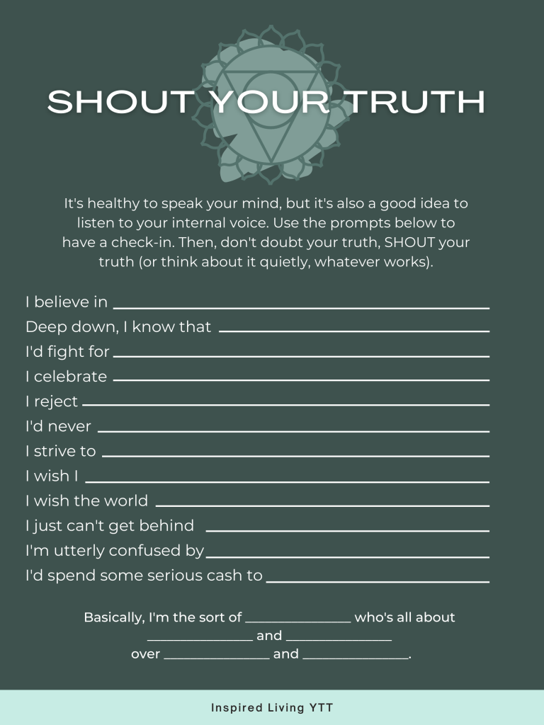 To speak your mind, you first need to know your mind. What do you believe in? What values do you follow? Take some time to check-in with yourself and connect to your “voice” – both your internal and external voice. Try this activity below to shout your truth!