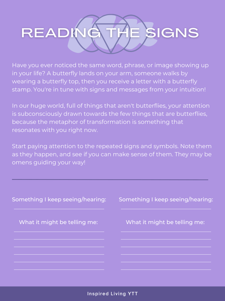 Have you ever noticed the same word, phrase, or image showing up repeatedly in your life? If so, you may be receiving a message from your inner advisor! The next time this happens, write it down and analyze the messages that are being sent to you.
